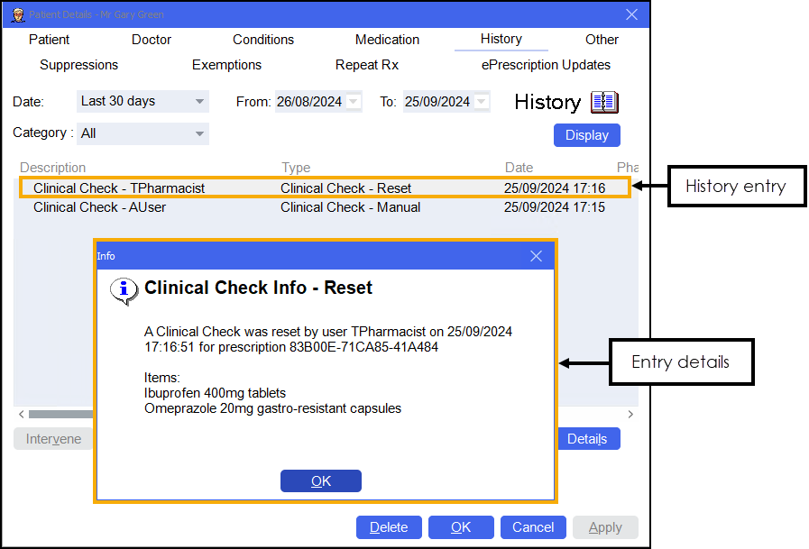 When a clinical check is reset an entry of Clinical Check - Reset displays in the patient's history.