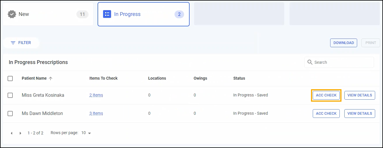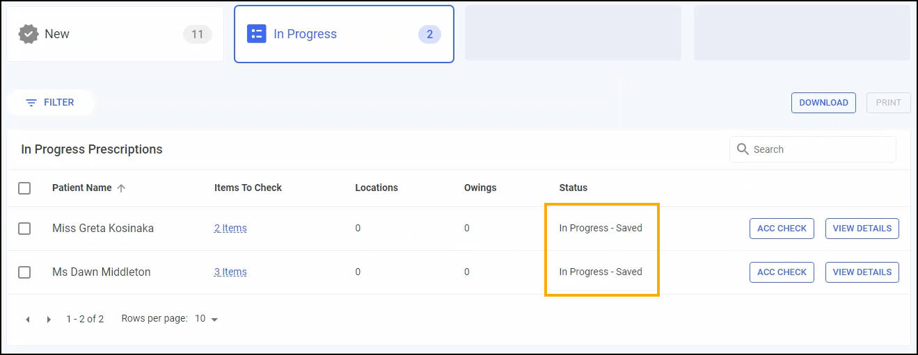 Any saved progress deletes and the prescription grouping displays on the In Progress screen with a status of Awaiting Accuracy Check.