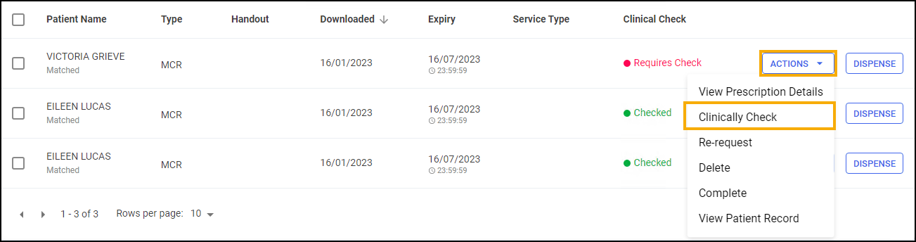 From the Prescriptions - New screen, select ACTIONS - Clinically Check next to the prescription you want to check.