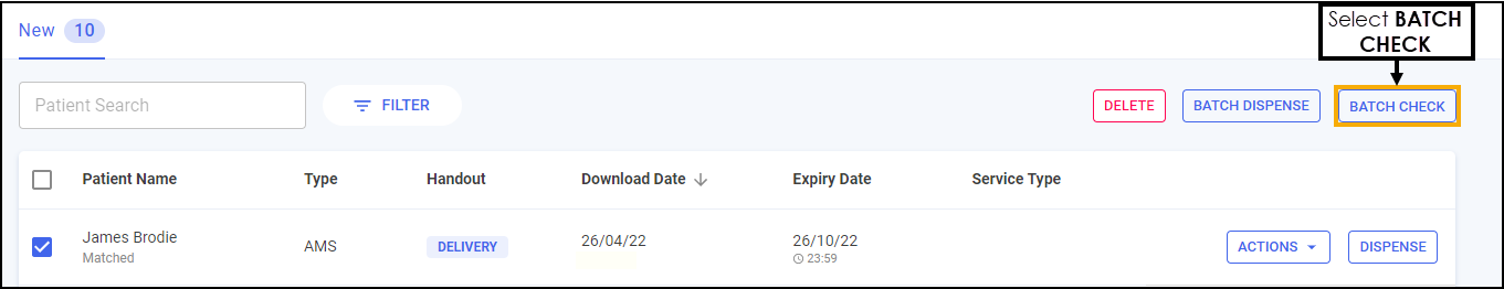 From the Prescriptions - New screen, highlight one or more prescriptions for the same patient and then select BATCH CHECK