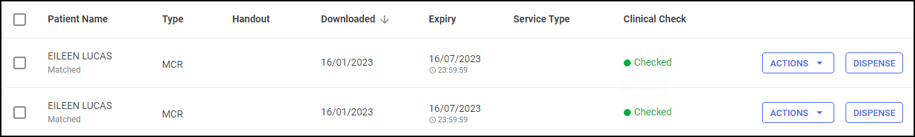 Pharmacy Manager returns to the Prescriptions - New screen and the Clinical Check column updates to display the prescription(s) as Checked.