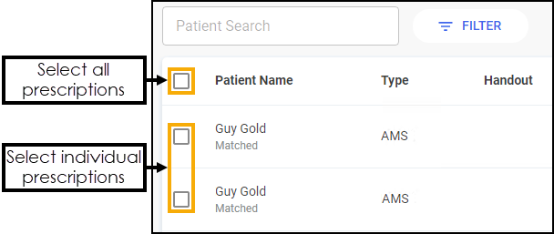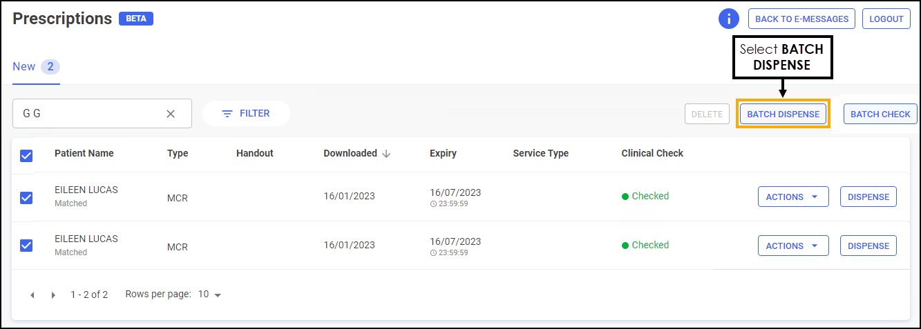 Select the prescriptions to dispense, either individually or chose the column to select all: