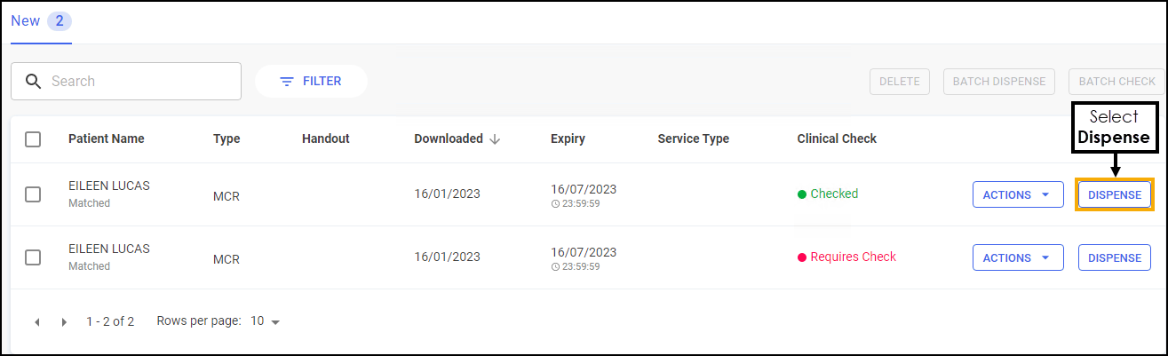 Prescriptions can be dispensed either individually or as a prescription grouping from the Prescriptions - New screen
