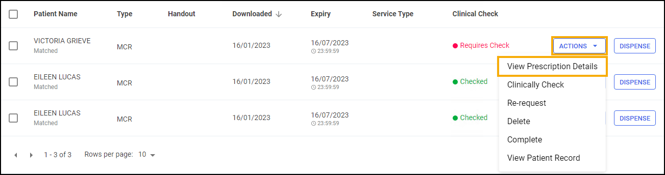 To the right of the unmatched prescription, select ACTIONS and then View Prescription Details: