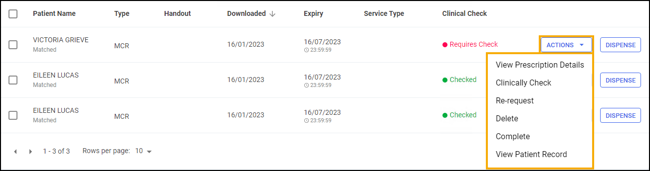 Clinical Check - Displays the clinical check status, either Requires Check or Checked.