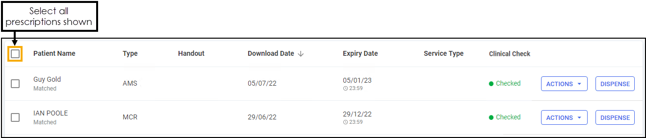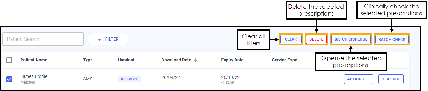 BATCH DISPENSE - Select to dispense as a prescription grouping, see Dispensing New Prescriptions (Scotland) for details.