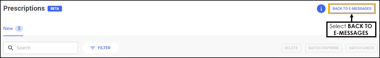 To access the existing eMessages screen from the Prescriptions - New screen select BACK TO E-MESSAGES