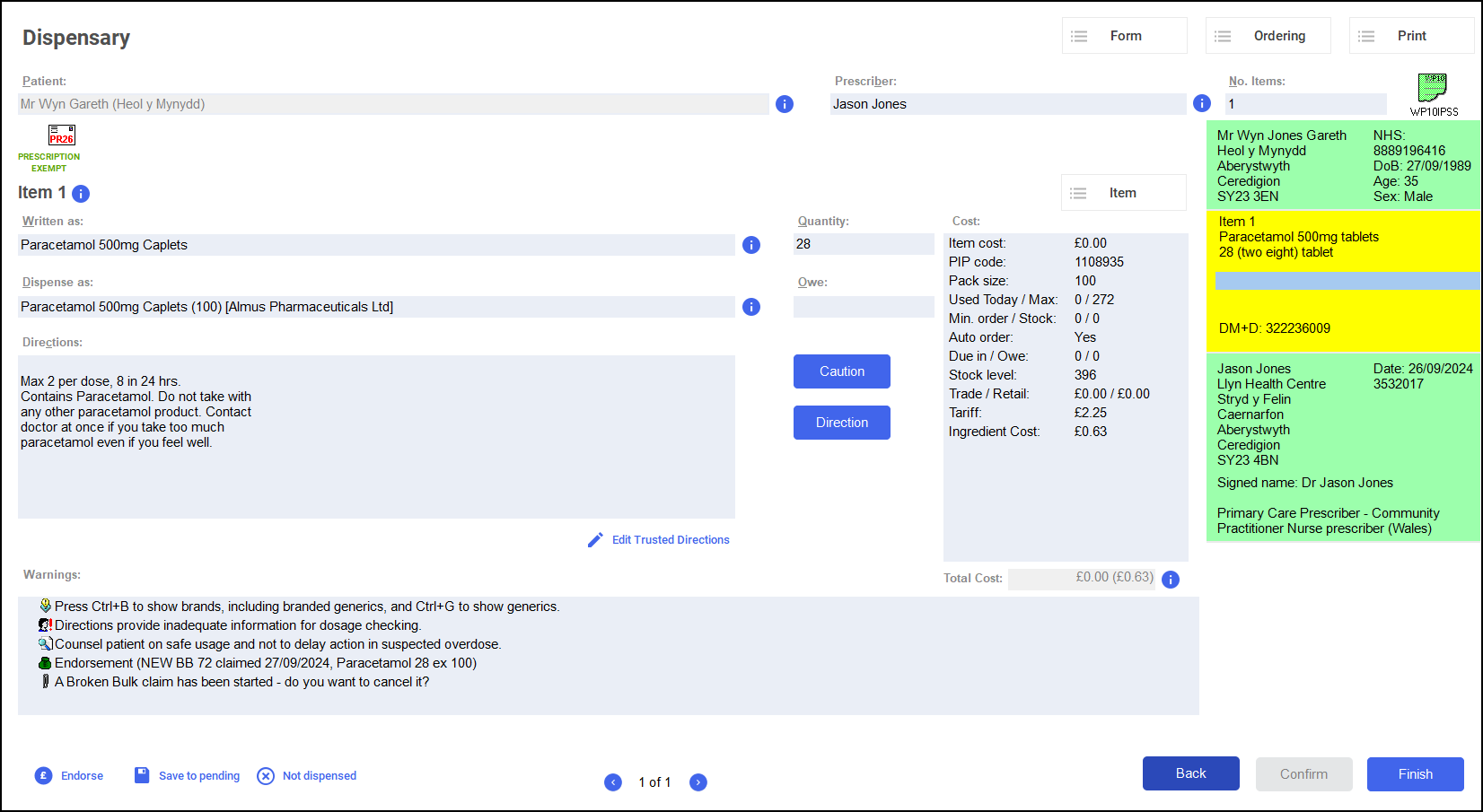 Note - If enabled, Fast Labelling automatically populates the following information: Patient, Prescriber, Written As, Quantity and Directions. See Fast Labelling for details.Note - If the prescriptions have been clinically checked upfront, the warnings are pre-confirmed on the Dispensary screen. However if anything is changed during the dispensing process, such as selecting a different item with a different dm+d code, an additional warning may display that needs to be confirmed before continuing.