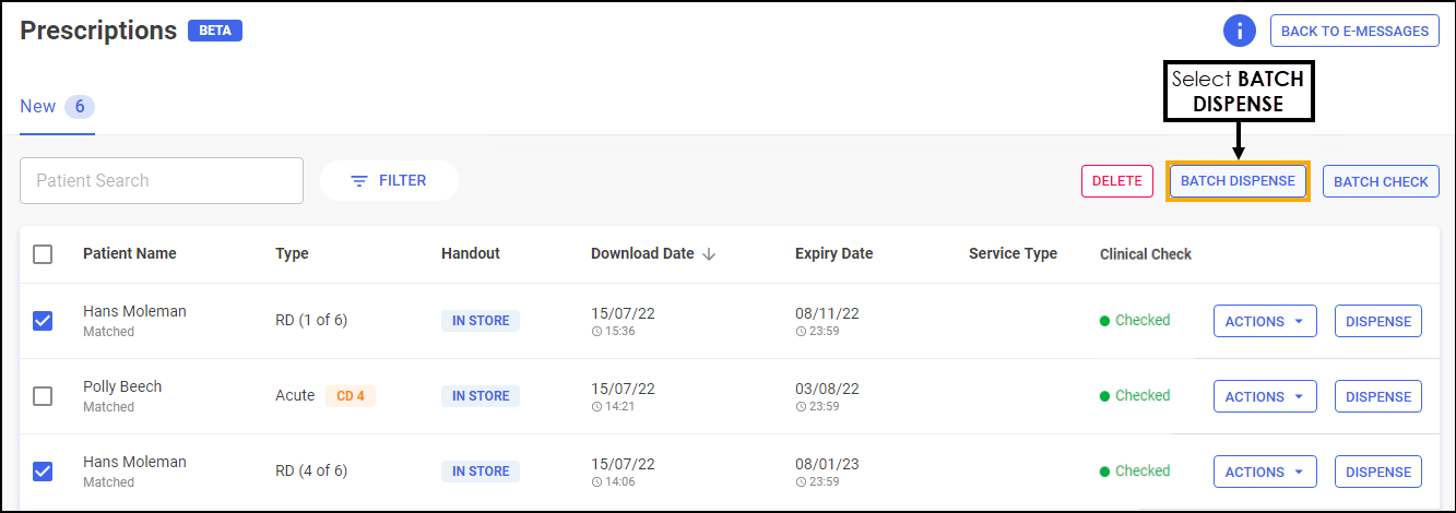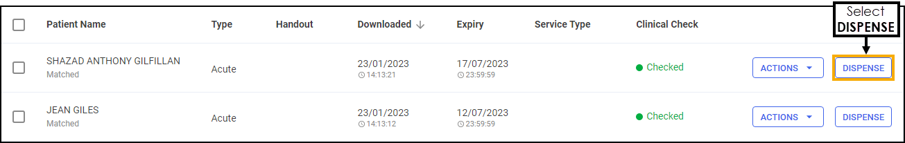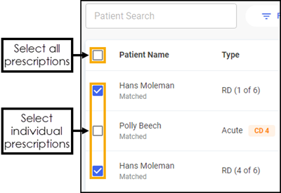 Select the prescriptions to dispense, either individually or choose the column to select all.