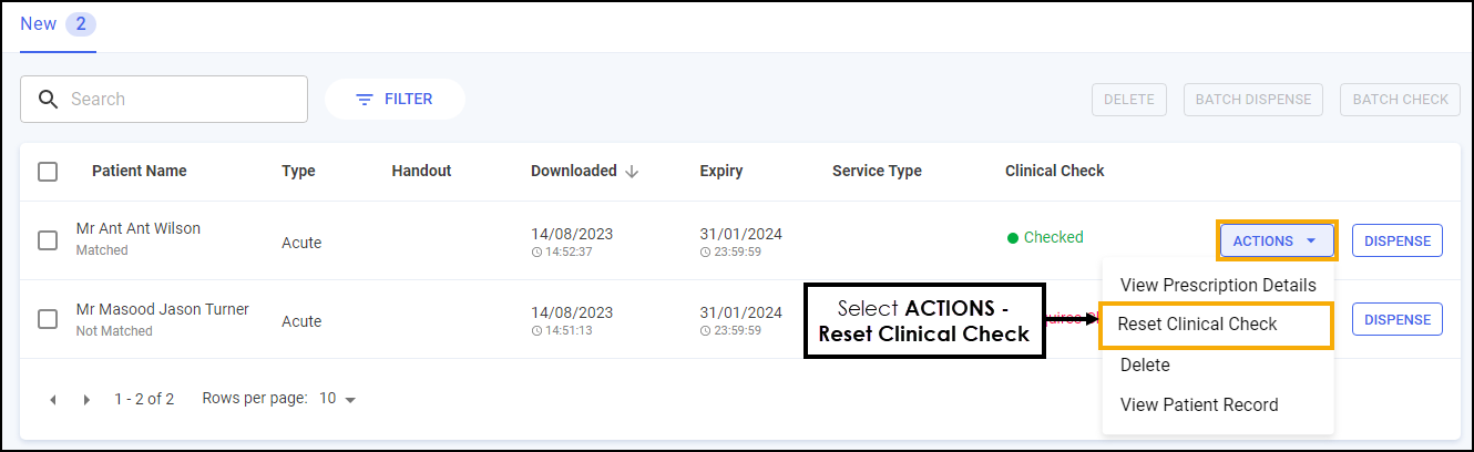 Note - Reset Clinical Check is only available for prescriptions with a status of Checked.