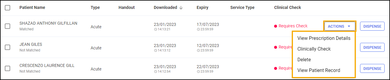 View Prescription Details - Select to view the prescription, this opens the eMessage Details screen, see eMessage Details Screen for details. From here you can match the patient if required, see Matching Patients (Wales) for details.