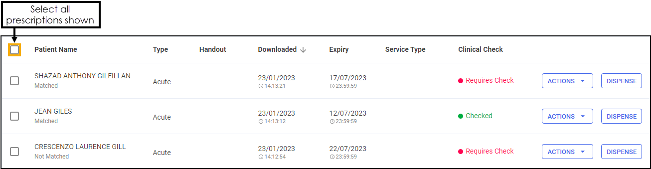 Select All - Use to select all prescriptions on the page.