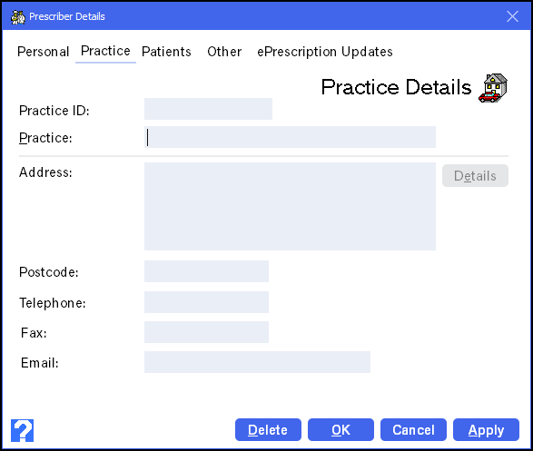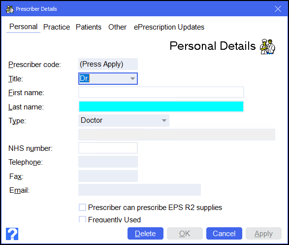Type - Select the prescriber type from the list. If the prescriber type is not listed for example Pharmacist Independent Prescriber you can select Other (Please specify), an additional text box activates, manually enter the prescriber type.