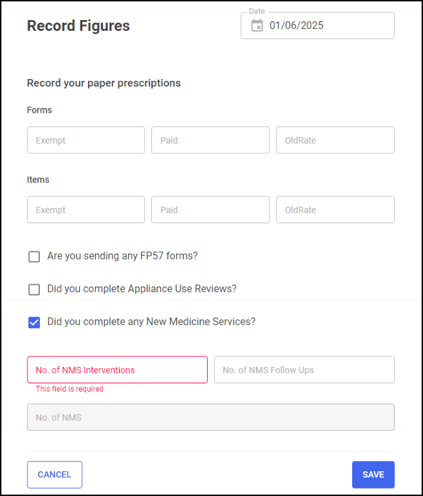 To record your prescription figures for paper prescriptions, NMS, FP57 refunds or AURs: