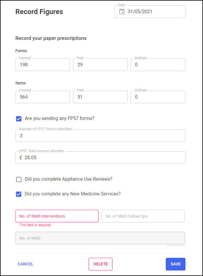 NMS - Number of New Medicine Services completed split into Interventions, Follow Ups and Total.