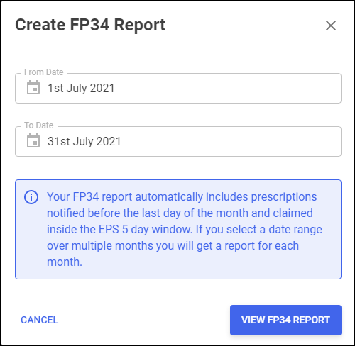 Note - The FP34 report automatically includes prescriptions notified before the last day of the month and claimed inside the EPS 5 day window.Note - If you select a date range over multiple months you will get a report for each month in the same output. -