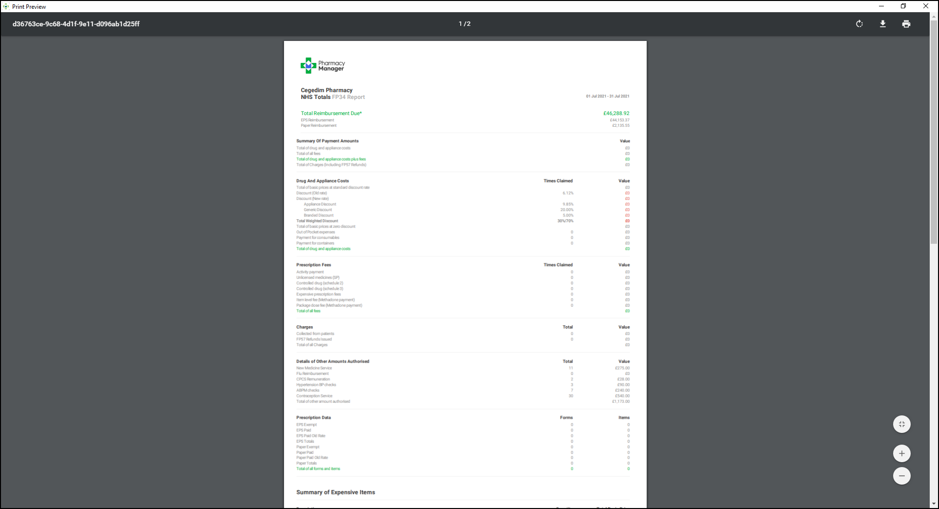 The FP34 report displays a detailed breakdown of the Total Reimbursement (see note below) you should expect based on the values claimed over the selected date range. The report captures Drug and Appliance costs, Prescription Fees, charges collected from patients, your prescription totals data and provides a summary of your expensive items.