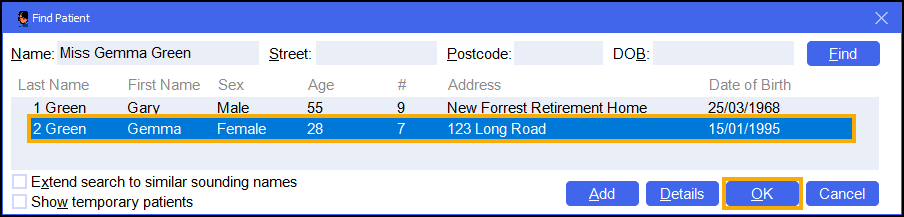 The Find Patient screen displays. Select the patient and select OK
