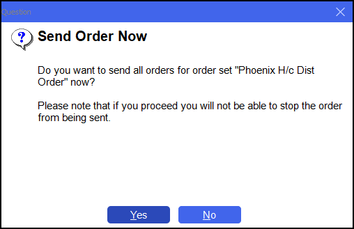 A question 'Do you want to send all orders for order set "Order set name" now?' displays, select Yes