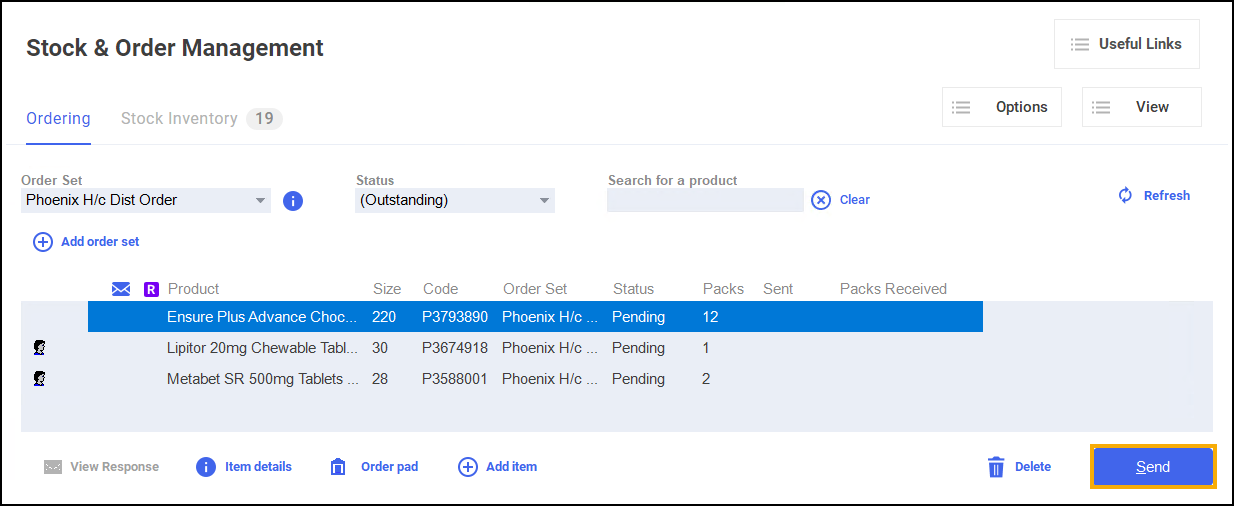 After you have checked through your orders, you must send the order through to the wholesaler. To send an order: