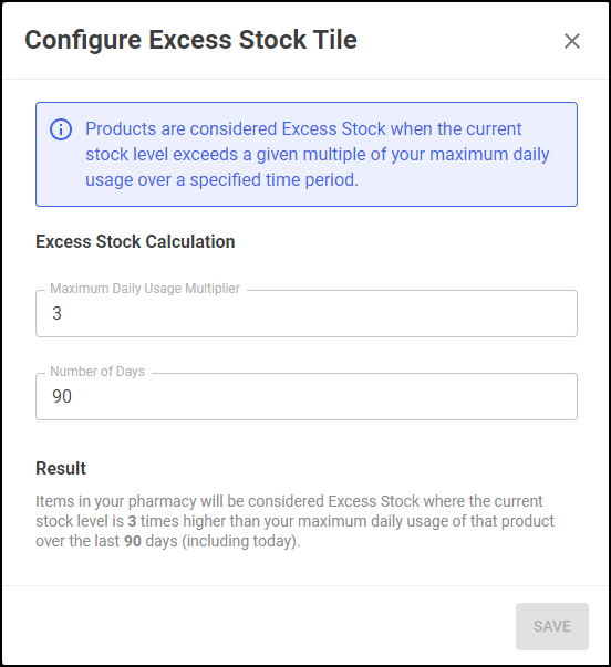 This displays a count of the number of products within the pharmacy that are deemed excess stock: