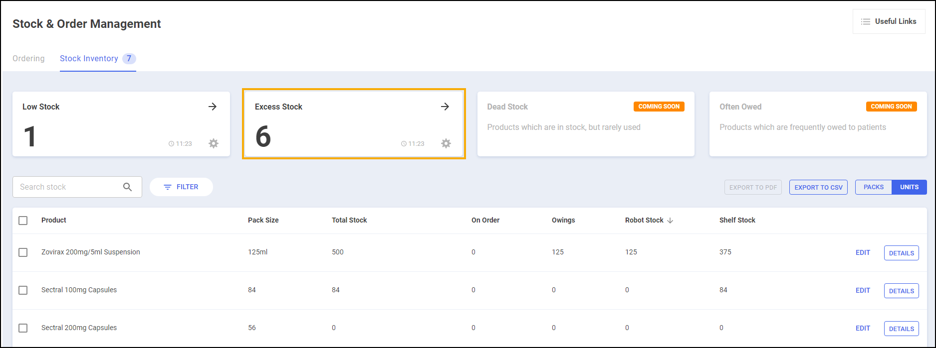 We have added an Excess Stock tile to the Stock Inventory screen.