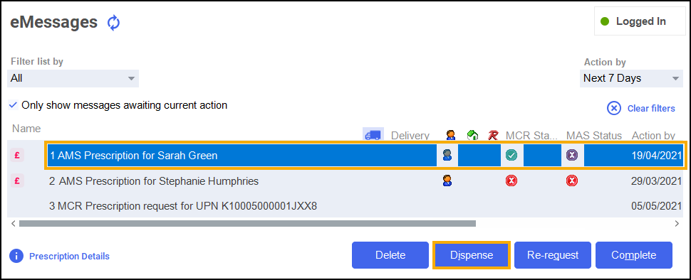 To dispense an Acute Medication Service (AMS) prescription: