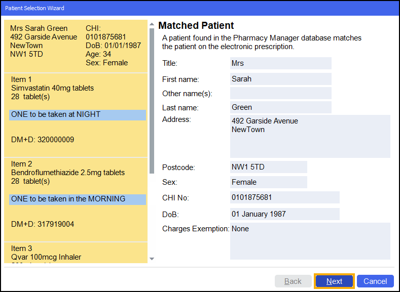 The Matched Patient screen displays, confirming the patient matches a patient already in Pharmacy Manager. Select Next