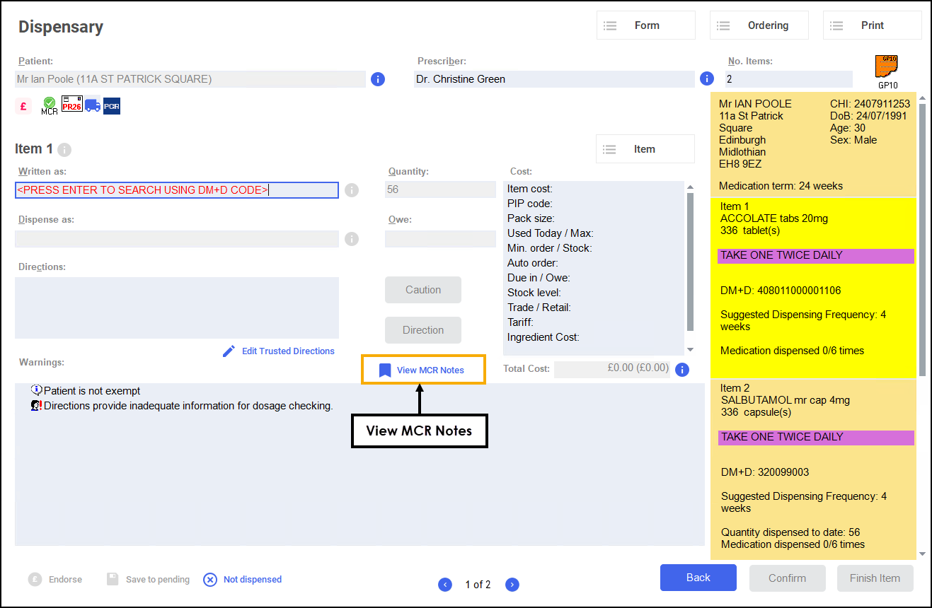Training Tip - Any notes added into View MCR Notes display on the MCR Treatment Summary Report, see MCR Treatment Summary Report (TSR) for details.Training Tip - To print the prescription from the Dispensary screen, select Print - Print Prescription or press Shift + Alt + P on your keyboard. -