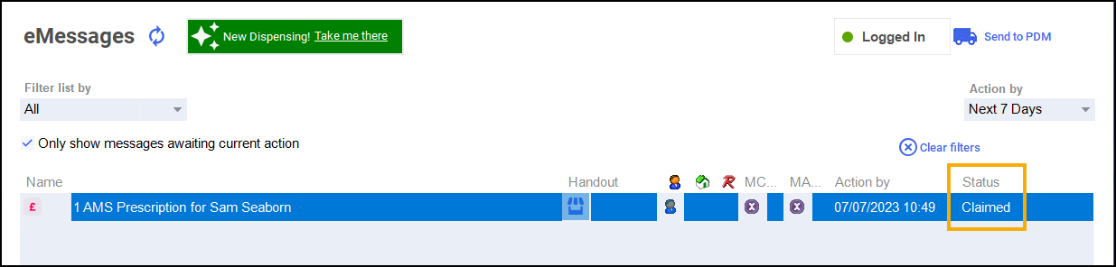 Scan the barcode on the prescription to highlight the prescription. If the claim was successful the Status displays as Claimed: