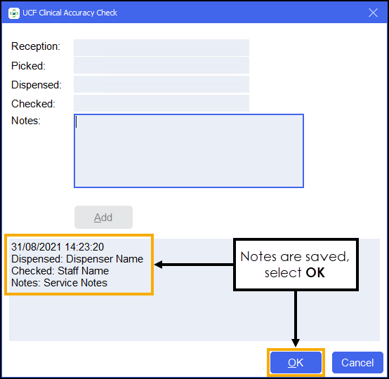 The UCF Clinical Accuracy Check screen displays. Enter relevant text in the boxes as required. This may be a record of the staff member who carried out a particular stage, notes about the suitability of the medication provided as part of the service or the appropriateness of the quantity and its dose frequency for the patient: