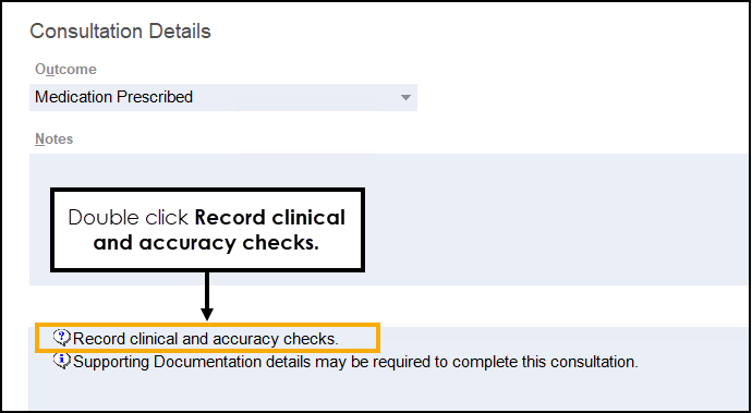 From the Consultation Details section of the UCF Supply, select Record clinical and accuracy checks: