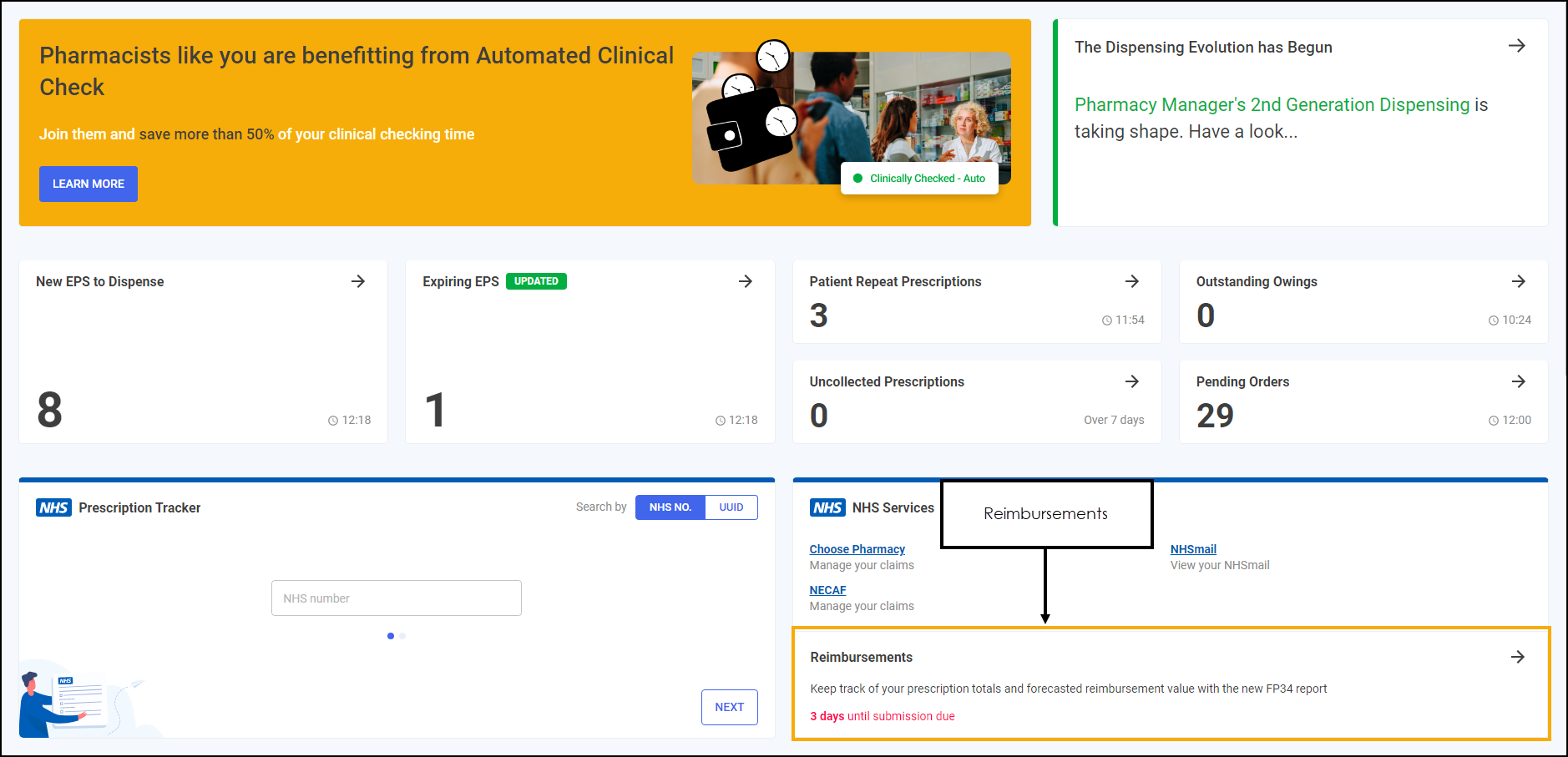 On the Pharmacy Manager Dashboard, from the NHS Services tile select the Reimbursements section.